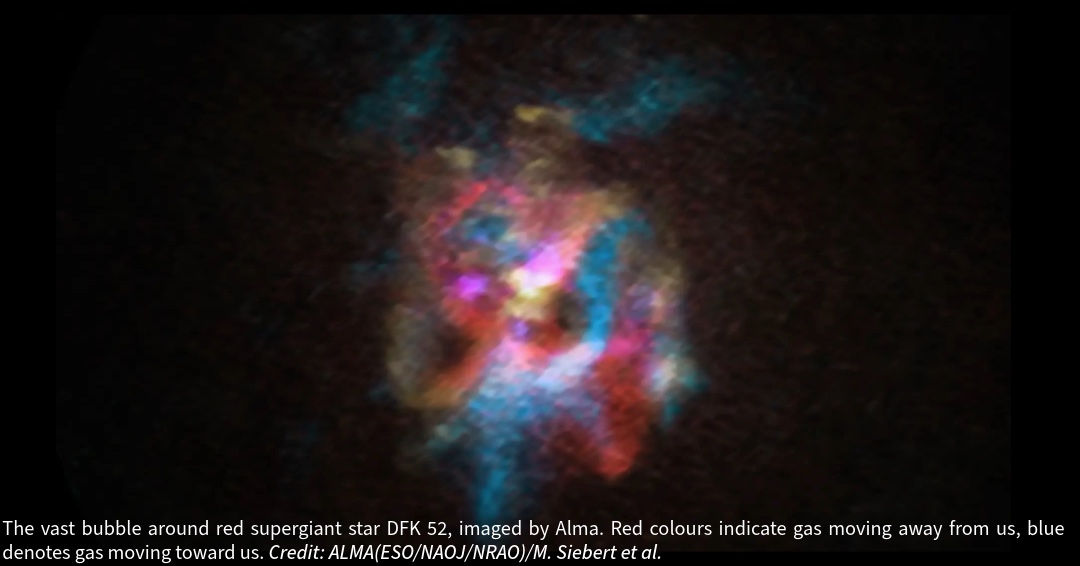 “We got a big surprise when we saw what ALMA was showing us. The star is more or less a twin of Betelgeuse, but it’s surrounded by a vast, messy bubble of material,” says Mark Siebert at Chalmers.
