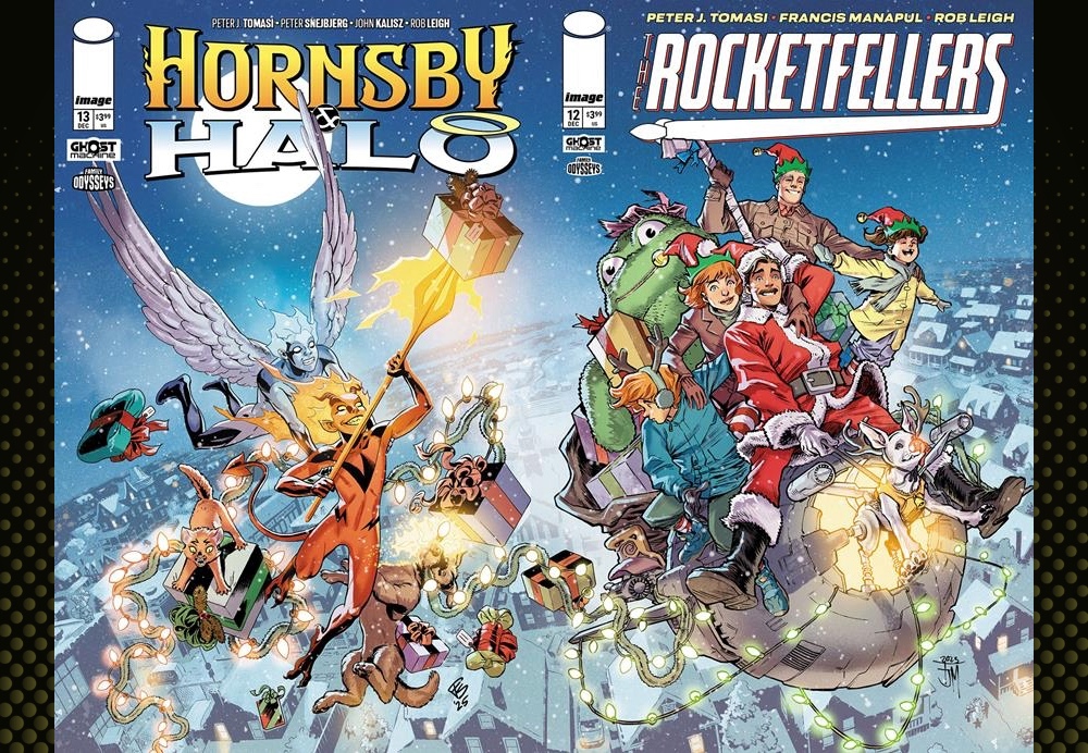 Fan-favorite Ghost Machine titles—Hornsby & Halo by Peter J. Tomasi and Peter Snejbjerg and The Rocketfellers by Tomasi and Francis Manapul—will jingle-jangle all the way to stores with a pair of connecting covers by Snejbjerg and Manapul this December.