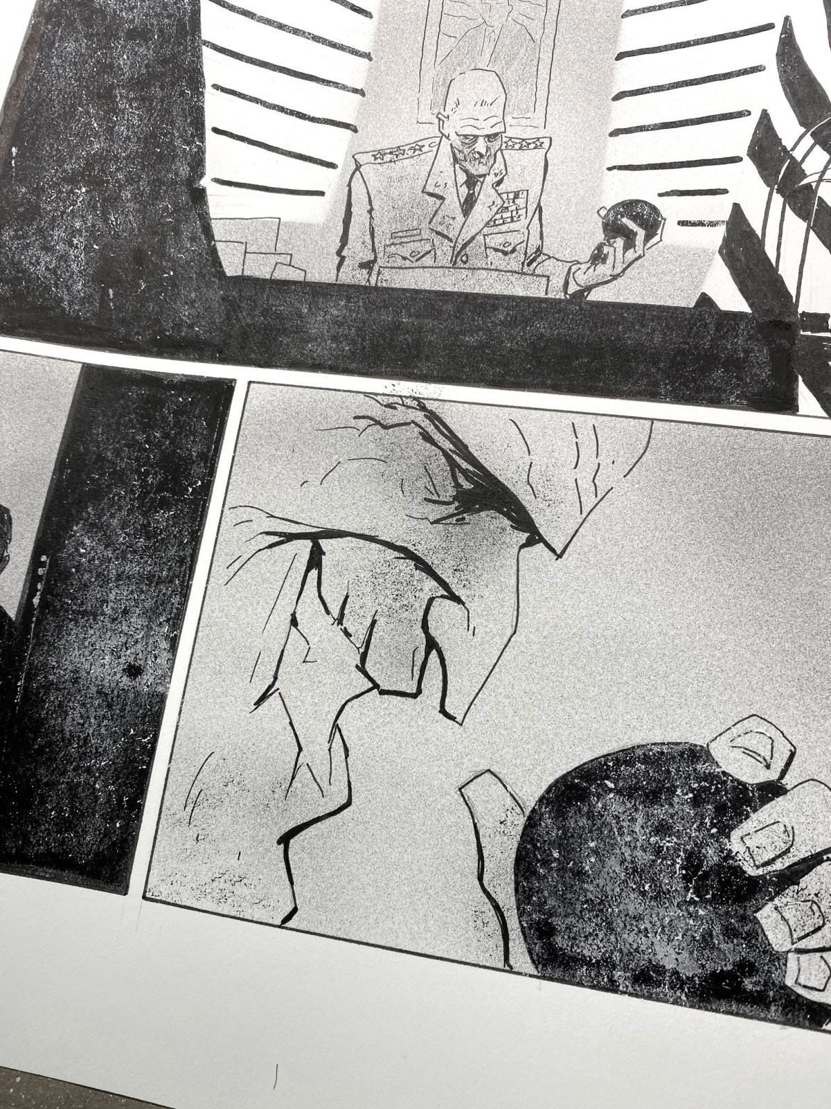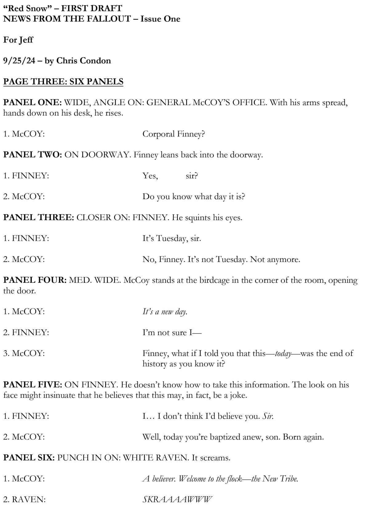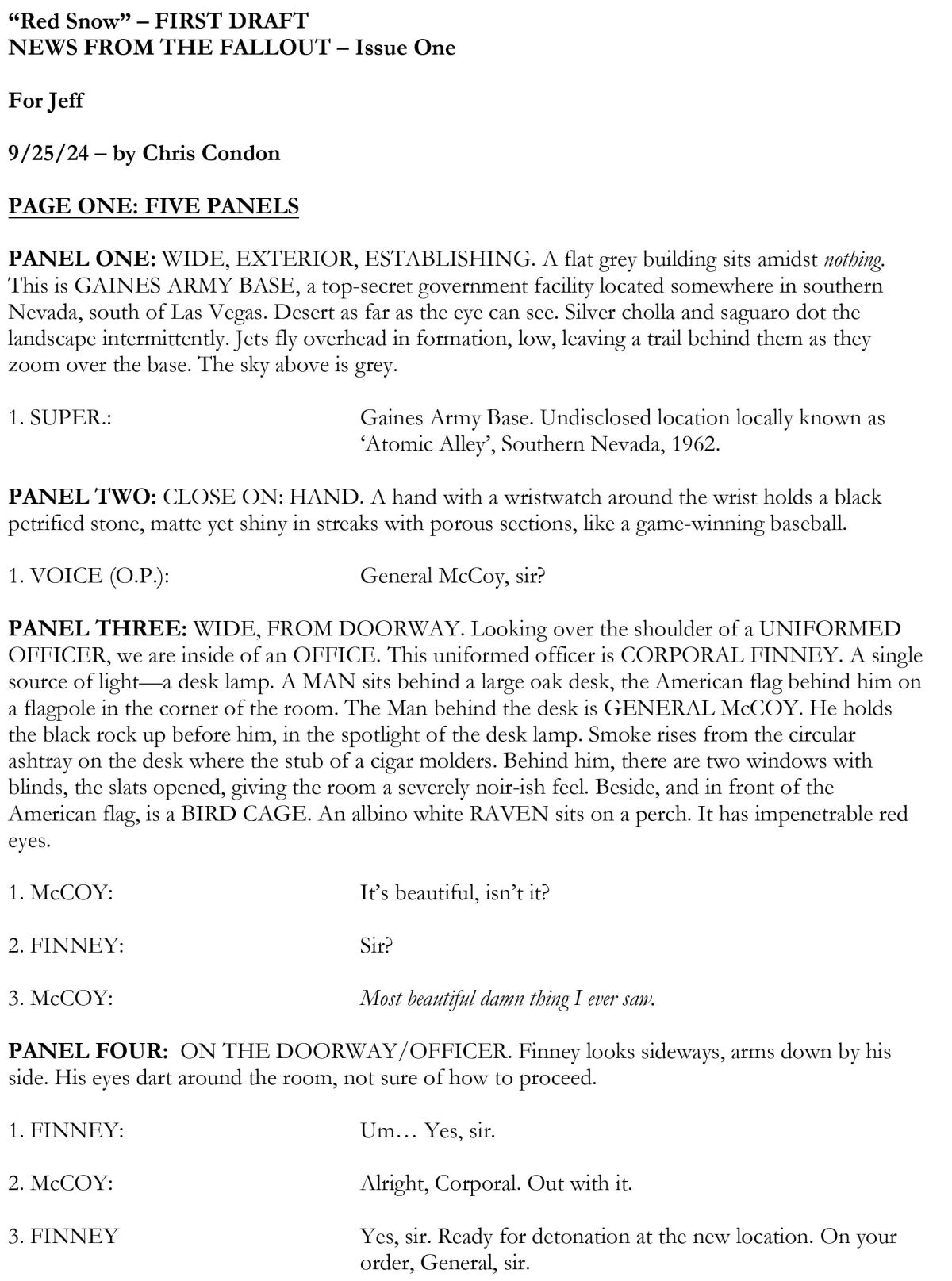 “My main goal with page one was to establish the setting and the tone of what we’re about to experience,” said Condon. “I think the first panel, let alone the first page, is essential to telling a reader whether this book is going to be any good or not. In the first panel, we establish that we are in a sparse desert landscape, specifically at a top-secret army base. I think setting a book up like this is laying down cards in a game of poker. You’re revealing your hand. So, as panel one establishes the setting, panel two establishes a vital piece of the comic: a black petrified rock. Then we pull back to reveal who is holding that rock. This person is also a pivotal piece of the puzzle. This is our villain: General Sheridan P. McCoy. As the rest of the page plays out, we get to see that the general is preoccupied with his personal goals and, for some reason, they seem to be entwined with that stone.”