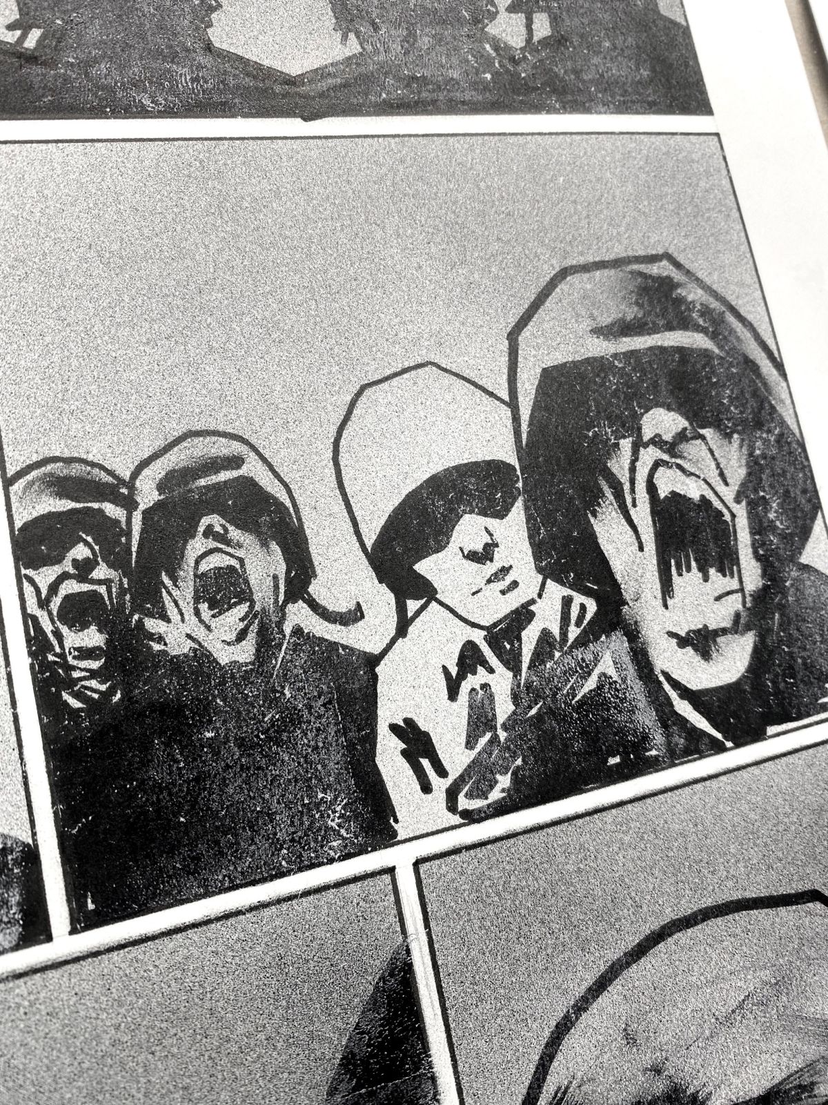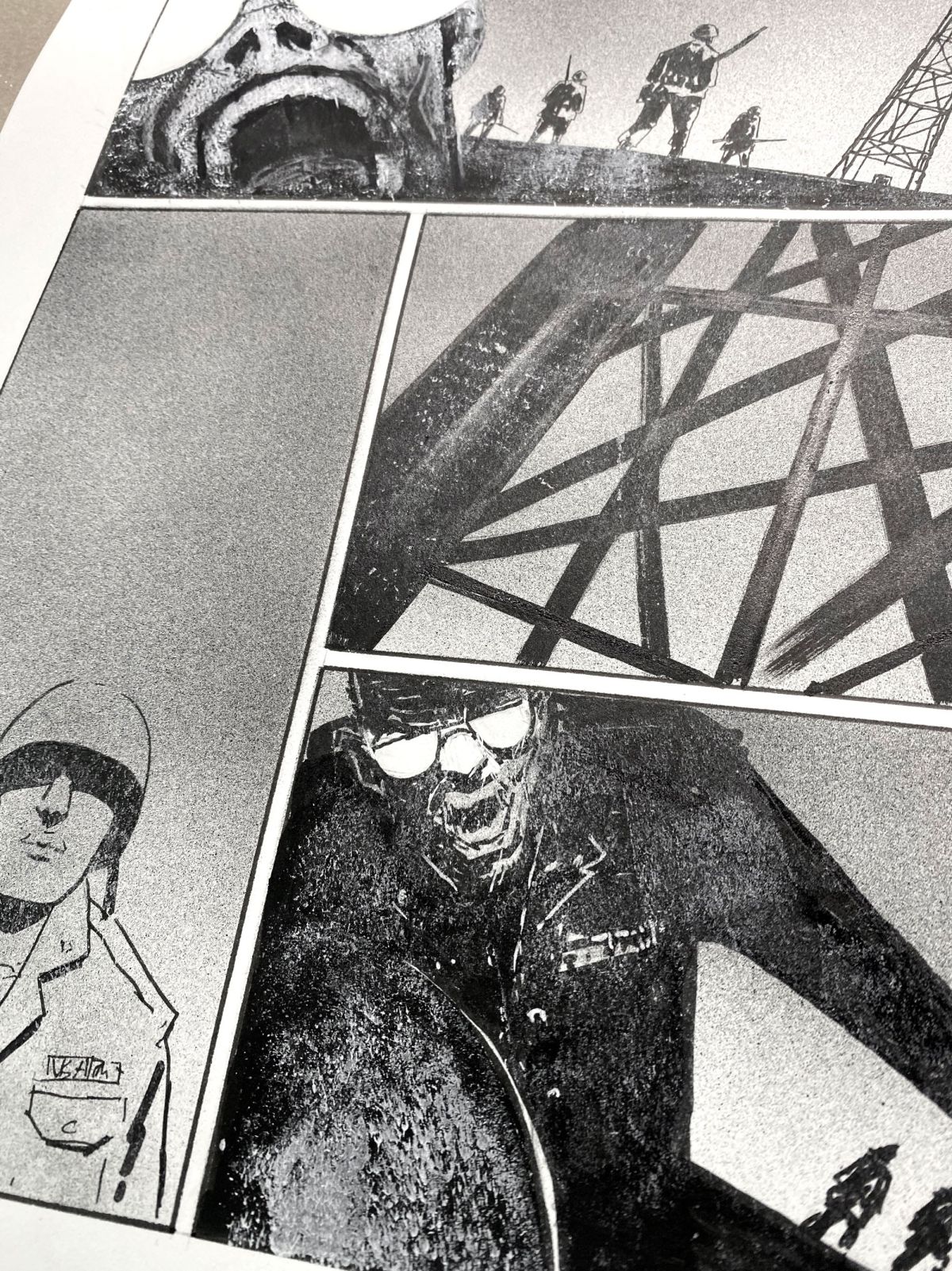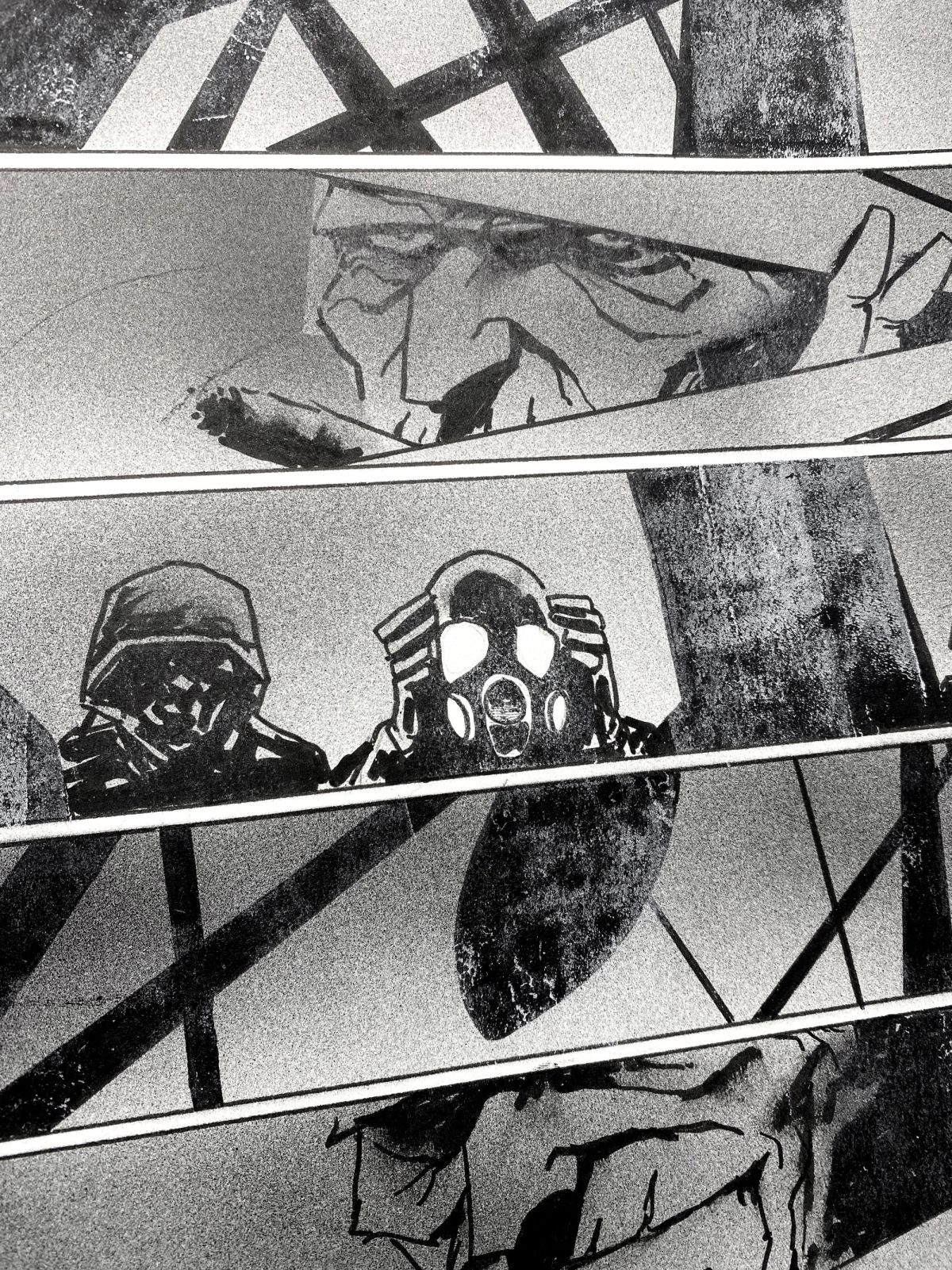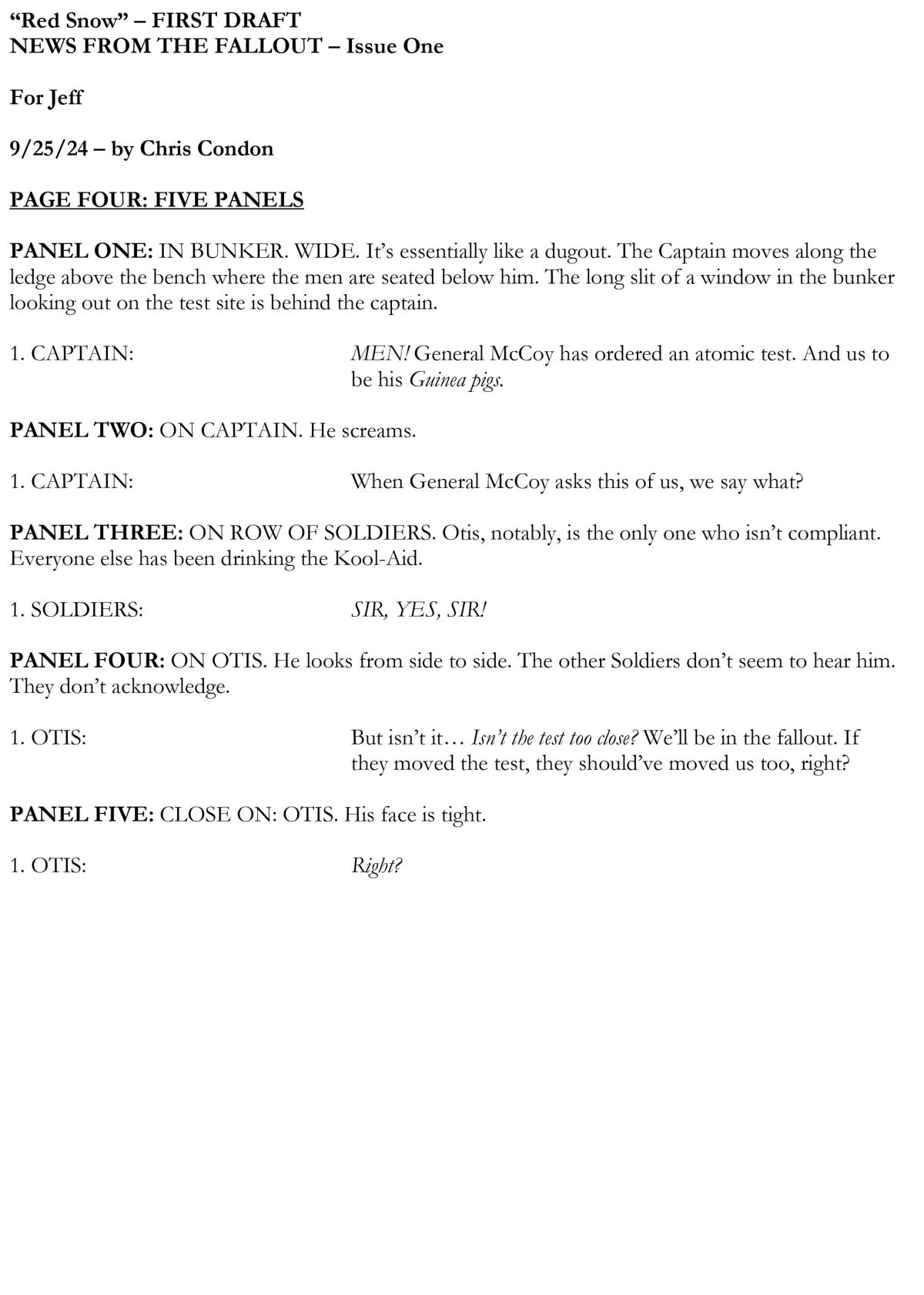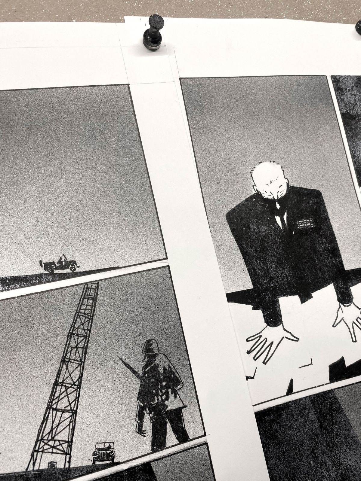Condon also remarked on the final pages of the preview: “At this point, we’ve established the juxtaposition of two characters, General Sheridan P. McCoy and Private Otis Fallows, and their two environments. So now, as the tension ratchets up and the bomb is closer than ever to dropping, we reflect that in just how we are juxtaposing those two things. Instead of spending a page with each of them, we’re now cutting between panels. Then, the bomb begins to drops. We see the sycophantic, quasi-religious view of the superior officer as the bomb drops – a smile on his face. The splitting of the atom reflected in his polarized lenses. Then we see, across a massive double-page spread, the bomb itself. This tells us the obvious—the bomb has been dropped. But it also tells us that the situation we’ve been ramping up toward has come to pass. No longer are we juxtaposing these two, we’re now past that point. Something has happened. Everything has changed. And nothing is ever going to be the same again.”