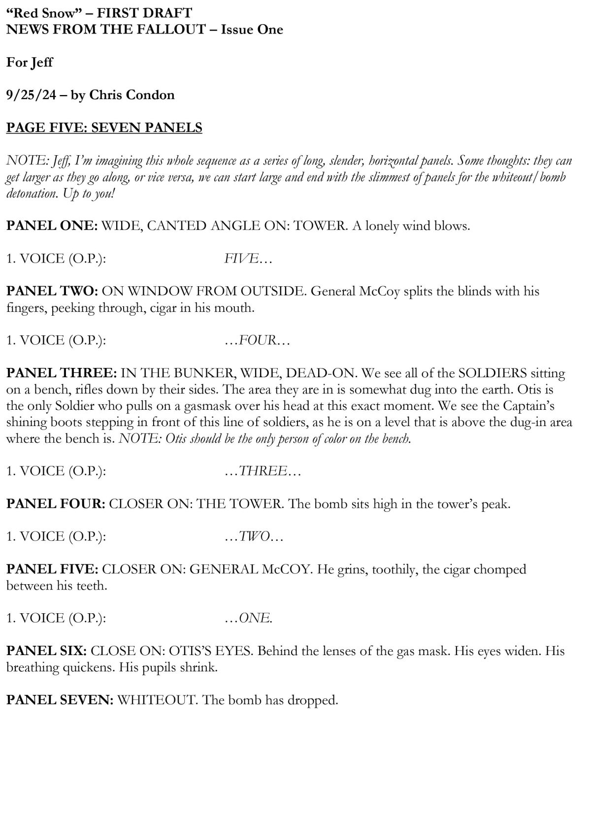 Condon added: “I want the reader to enter into this comic at a sprint. There’s no slow, plodding exposition. We jump into it. We show you pieces of information—a location, a rock, a general. You should, theoretically be able to take those disparate elements, understand that these things are important together, and then move onto the next page. We are also establishing TENSION. An inherent tension. The dropping of the bomb. We know how that works—it’s ingrained in us even though my generation and the generations that followed never did a duck-and-cover drill. The ominous countdown. A countdown to what? A reaction…”