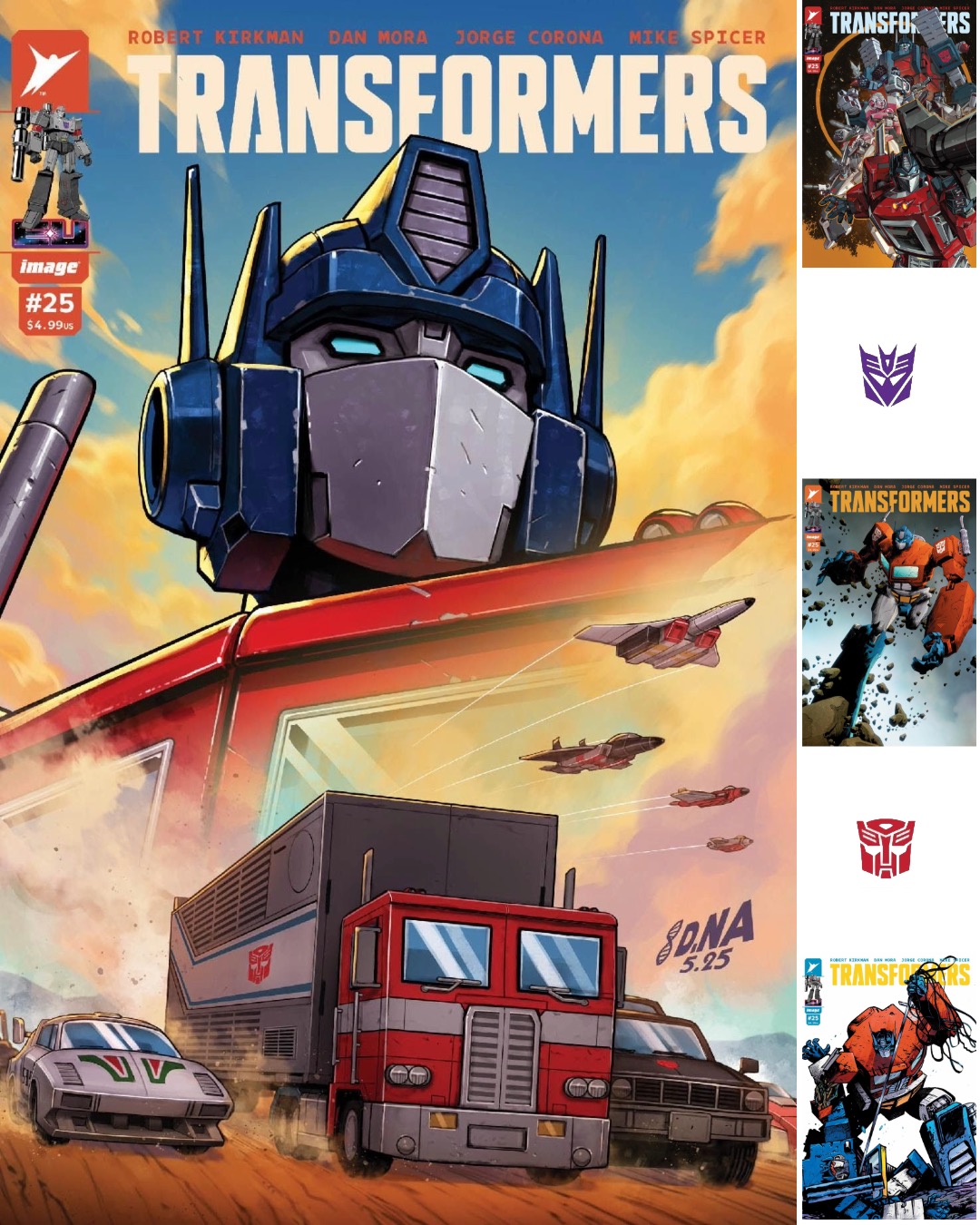 In addition to the main cover by David Nakayama, the lineup of variant covers for Transformers #25 includes an open-to-order cover by Daniel Warren Johnson & Mike Spicer, incentive variant covers by Jorge Corona & Mike Spicer, Kael Ngu, Dan Mora, Jae Lee & June Chung, Autobot & Decepticon blank sketch covers, and specialty finish covers by David Nakayama, John Amor, and Leonardo Romero.