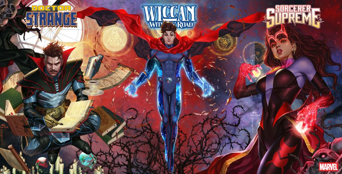 Check out the first three main covers by Leirix along with variant covers by Rose Besch, Mark Brooks, Devmalya Pramanik, and Jenny Frison. In addition, check out the first three of Russell Dauterman’s variant covers as well as a variant cover spotlighting his original design sheet for Wanda’s new look. Plus, Inhyuk Lee captures the current state of Marvel magic in newly revealed connecting covers for WICCAN: WITCHES’ ROAD #1, DOCTOR STRANGE #1, and SORCERER SUPREME #1, all on sale in December, and Marvel’s Stormbreaker artist Geoff Shaw’s Winter Break Variant Cover for SORCERER SUPREME #1 is unveiled!